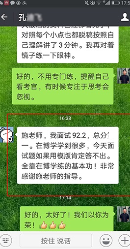 周老師善于因材施教,在大量的教學(xué)實(shí)踐中不斷總結(jié),創(chuàng)新面試培訓(xùn)“擊碎重塑法”7天快速提高體系,注重強(qiáng)化學(xué)員的自我認(rèn)知和對(duì)社會(huì)現(xiàn)實(shí)的認(rèn)知,從內(nèi)心深處改變學(xué)員面試心態(tài),重塑思維方式。他針對(duì)學(xué)員的不同性格特點(diǎn)和層次基礎(chǔ),設(shè)計(jì)不同的訓(xùn)練和評(píng)價(jià)方式,循序漸進(jìn)、諄諄善誘,從根本上解決“說不出、說不對(duì)、說不好”的普遍問題,使不少學(xué)員實(shí)現(xiàn)了從“難以啟齒”到“口若懸河”的轉(zhuǎn)變,被學(xué)員稱為“疑難雜癥專家”,備受推崇。 |