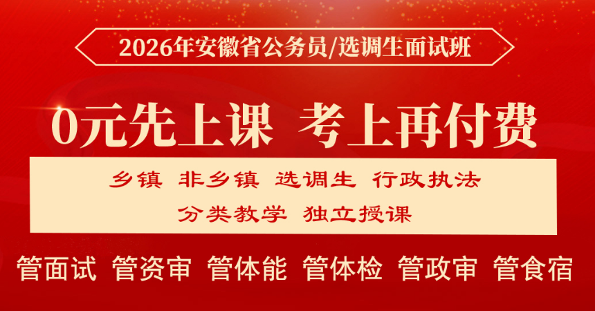 我們根據(jù)歷年面試考情定制了2026年安徽省公務(wù)員面試班,業(yè)內(nèi)實(shí)力專家團(tuán)隊(duì)將與您并肩戰(zhàn)斗!我們將提供科學(xué)的課程安排與出色的心理訓(xùn)練和技術(shù)指導(dǎo),戰(zhàn)勝一切對手!助您成公!